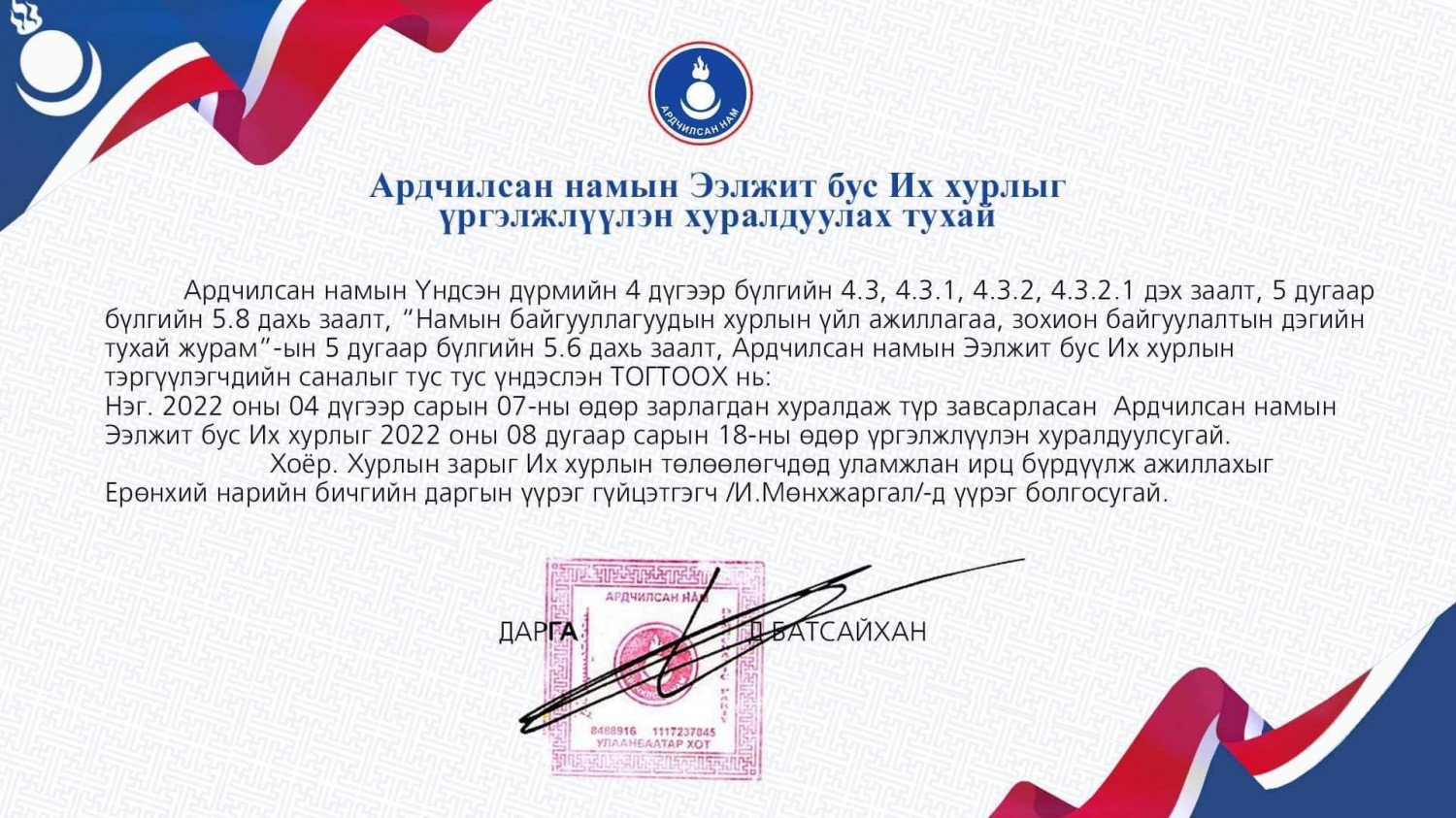 Ардчилсан намын Ээлжит бус Их хурал өнөөдөр болж байна. Хурлыг цахимаар явуулж буй бөгөөд орон нутаг дахь төлөөлөгчид оролцож, саналаа хэлэх боломж бүрдүүлснийг хурал даргалагч Д.Батсайхан дуулгав.